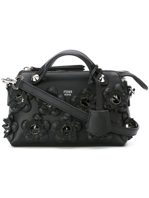 Black leather mini 'By The Way' crossbody bag from Fendi featuring top handles, a front centre logo stamp, silver-tone hardware, a top zip fastening, a detachable and adjustable shoulder strap, an internal slip pocket, an internal logo plaque and multiple black leather flowers with conical studs.