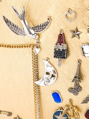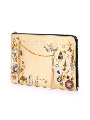 Gold-tone leather 'Charms and Trinkets' clutch from Marc Jacobs featuring a front centre logo stamp, a metallic foil finish, pin embellishments, a gold-tone and silver-tone chain embellishment, an all around zip fastening and an internal logo patch.