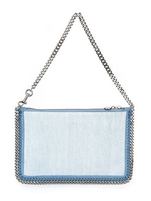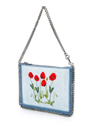 Blue and multicoloured cotton 'Falabella' floral denim clutch from Stella McCartney featuring a rectangular body, an embroidered floral design, a detachable chain handle, a top zip fastening, a logo disc zip pull, silver-tone hardware, a silver-tone chain trim and an internal logo patch.