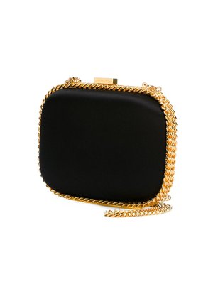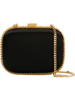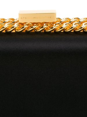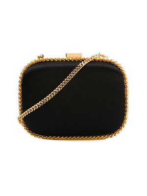 Black satin 'Falabella' cluch from Stella McCartney featuring a gold-tone chain trim, an optional chain strap, a top clasp fastening and a main internal compartment.